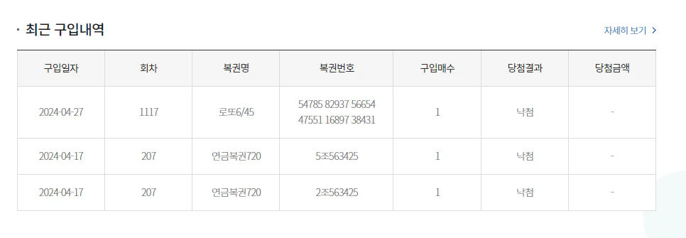 복권 추첨이 끝난 후 당첨 여부를 홈페이지에서 쉽게 확인할 수 있습니다. 우측상단의 마이페이지로 가면 최근에 산 복권이 보입니다.