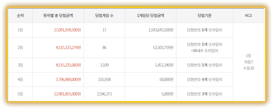 | 구분 | 인원 | 1인당 당첨금 | 비고 |