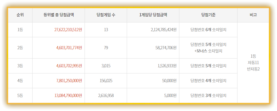 | 1등 | 13명 | 21억 2,478만 원 | 자동 11 / 반자동 2 / 수동 0 |