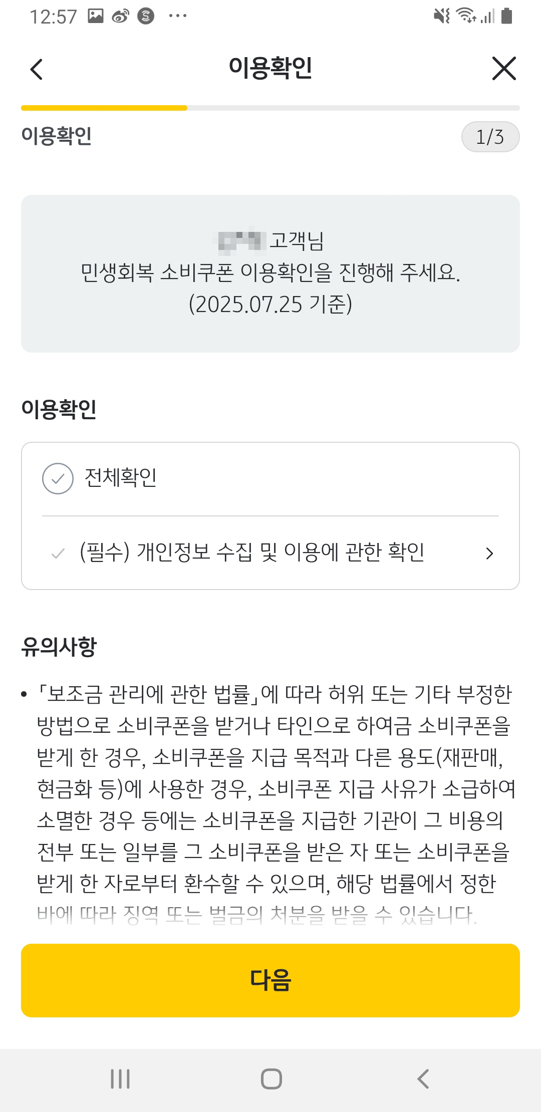 • 신청 기간, 유의사항이 보이며 하단에 노란색 ‘소비쿠폰 신청’ 버튼 클릭