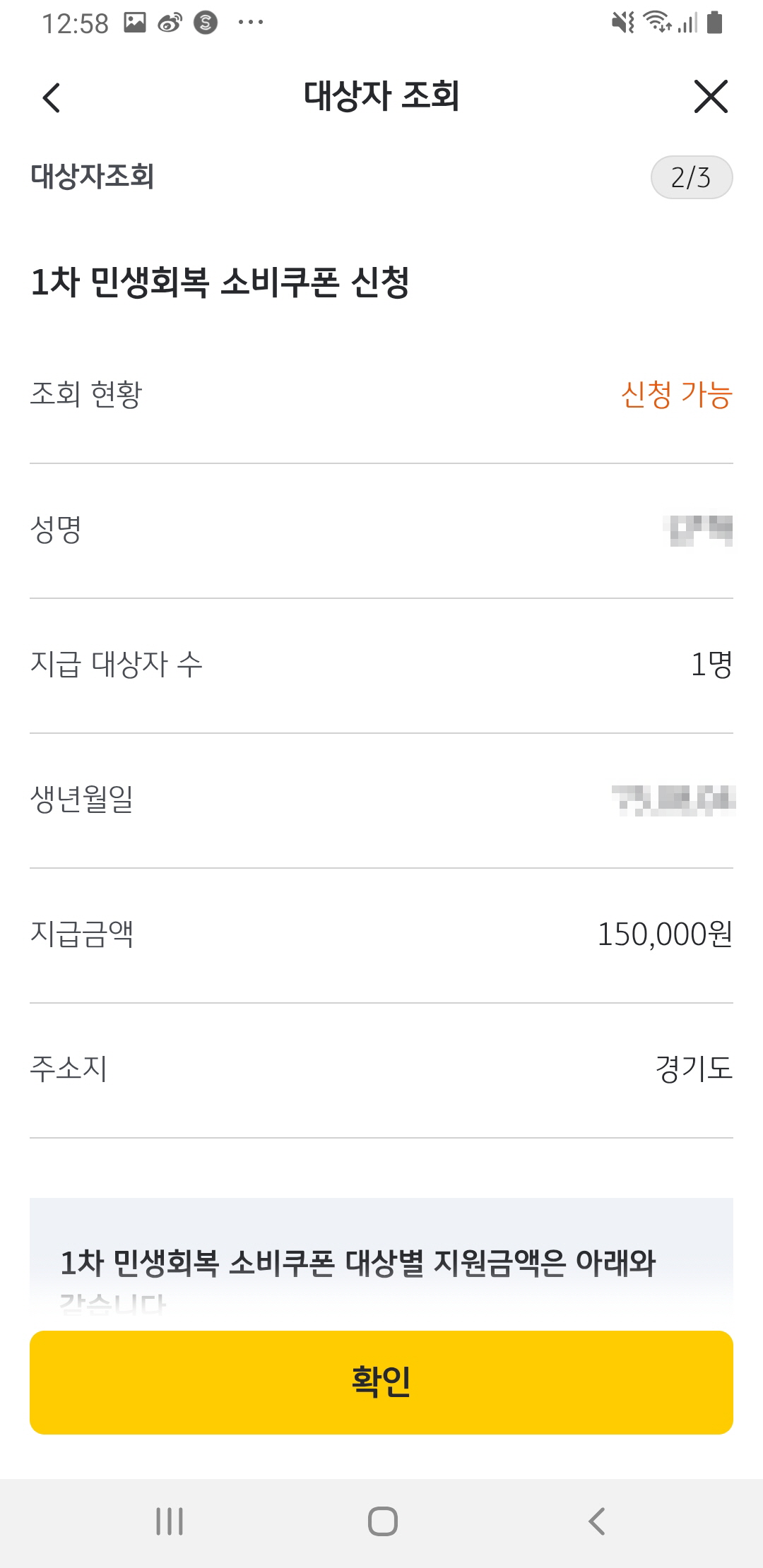 - 지급 대상자인 경우, 신청 가능 상태 및 예상 지원금(예: 150,000원) 확인