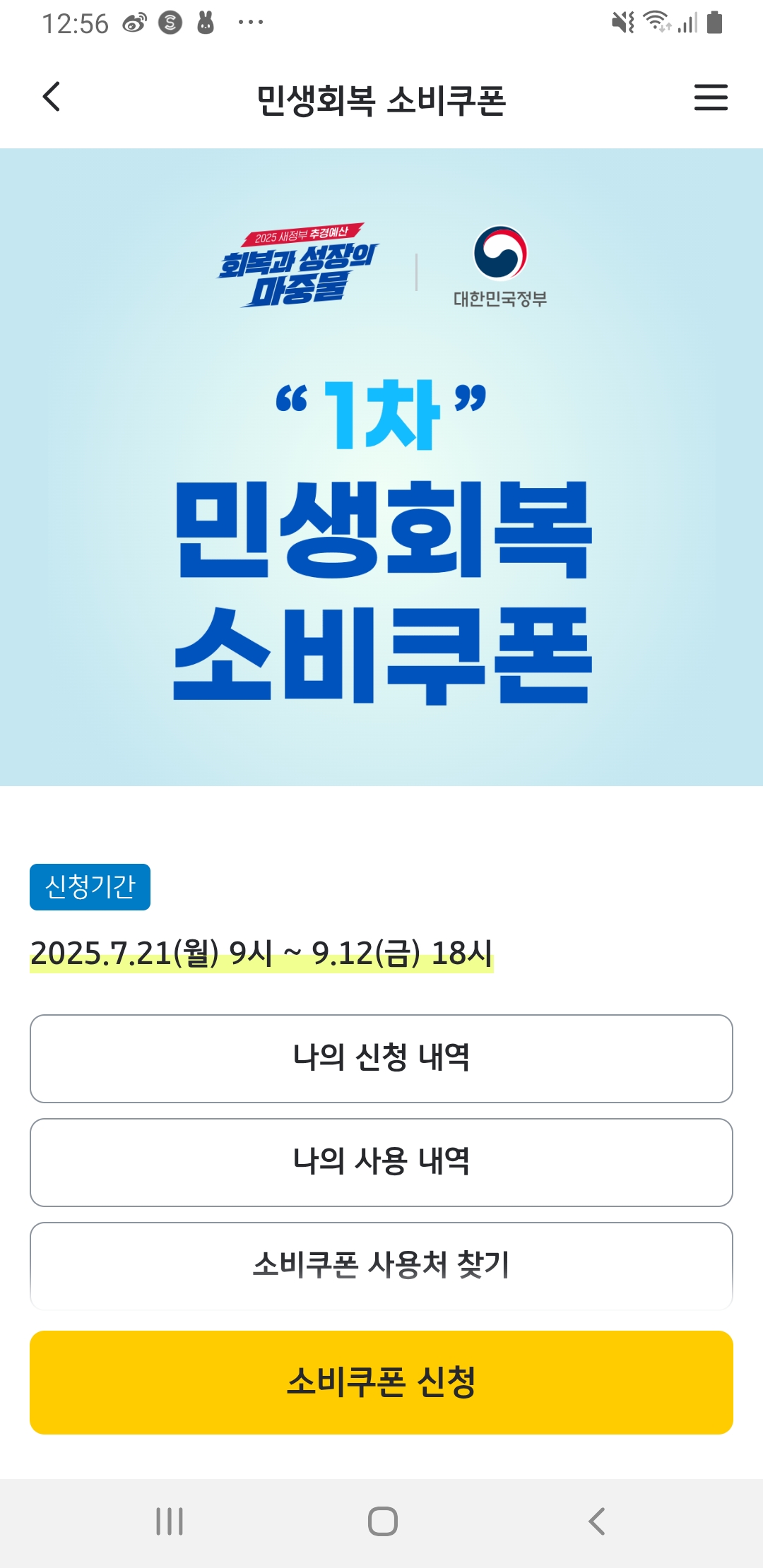 - 신청 기간, 유의사항이 보이며 하단에 노란색 ‘소비쿠폰 신청’ 버튼 클릭