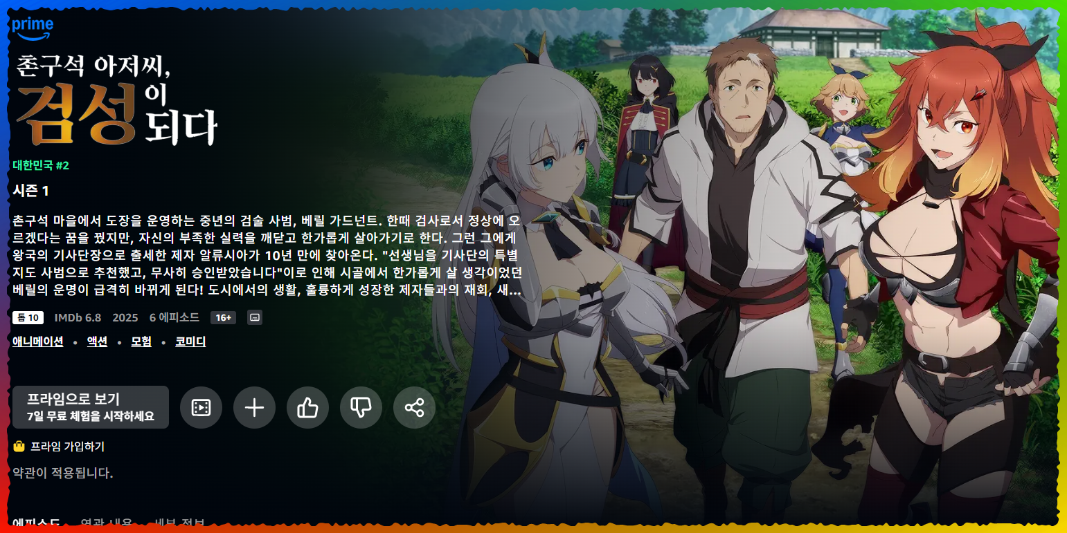네, 촌구석 아저씨, 검성이 되다 애니메이션은 아마존 프라임 비디오에서 독점 스트리밍되고 있습니다. 나무위키와 관련 웹 정보를 확인한 결과, 이 작품은 프라임 비디오를 통해 일본을 포함한 전 세계에 독점 송신되며, 일본 현지 TV 방영 후 바로 스트리밍이 시작됩니다. 한국어 자막도 제공됩니다.