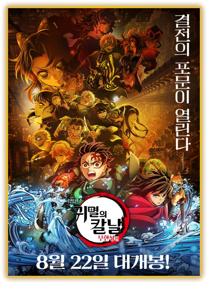 - 내용: 1기 이후의 이야기를 이어가며, 탄지로와 동료들(이노스케, 젠이츠)이 불꽃 기둥 렌고쿠 쿄주로와 함께 무한열차에서 강력한 귀신과 싸웁니다. 이 극장판은 스토리의 핵심 사건을 다루므로 절대 건너뛰면 안 됩니다!