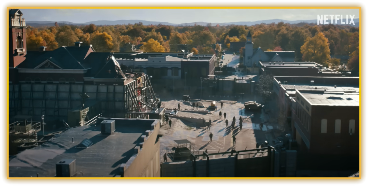 배경은 1987년 가을. 드론 숏으로 내려다본 호킨스에는 군용 완충 지대와 검문소, 버너 탱크가 빽빽이 들어서 있고, 균열 주변에는 붉은 포격 흔적이 선명합니다. 리프트 여파로 뿜어져 나오는 어둠의 포자 때문에 마을 전체가 ‘레드 존’으로 봉쇄됐습니다. 시즌 1의 한적한 시골은 완전히 사라졌고, 주인공들의 ‘집’은 이제 전면전의 최전방이 됐습니다.