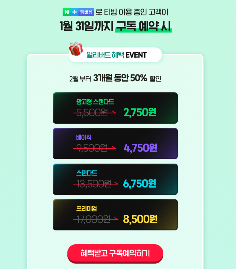 ✔ 네이버 멤버십 가입자는 1월 31일까지 신청하면 3개월 50% 할인