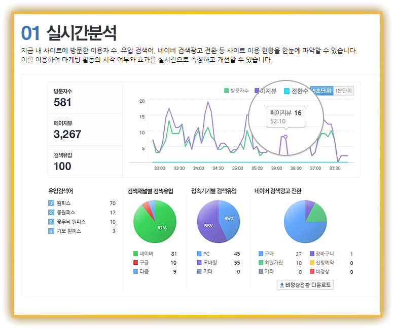 • 하단에 유입 검색어, 검색 채널 비율(네이버/다음 등), 접속기기(PC/모바일) 비율, 검색광고 전환 정보 표시
