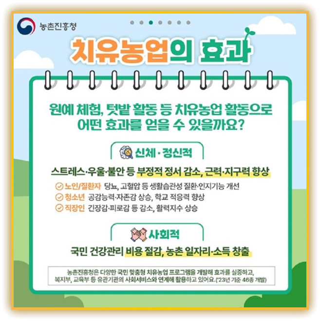 2021년 『치유농업 연구개발 및 육성에 관한 법률』 시행 이후, 농촌진흥청은 2022~2026년 제1차 종합계획을 수립해 치유농업을 본격적으로 육성하고 있습니다.