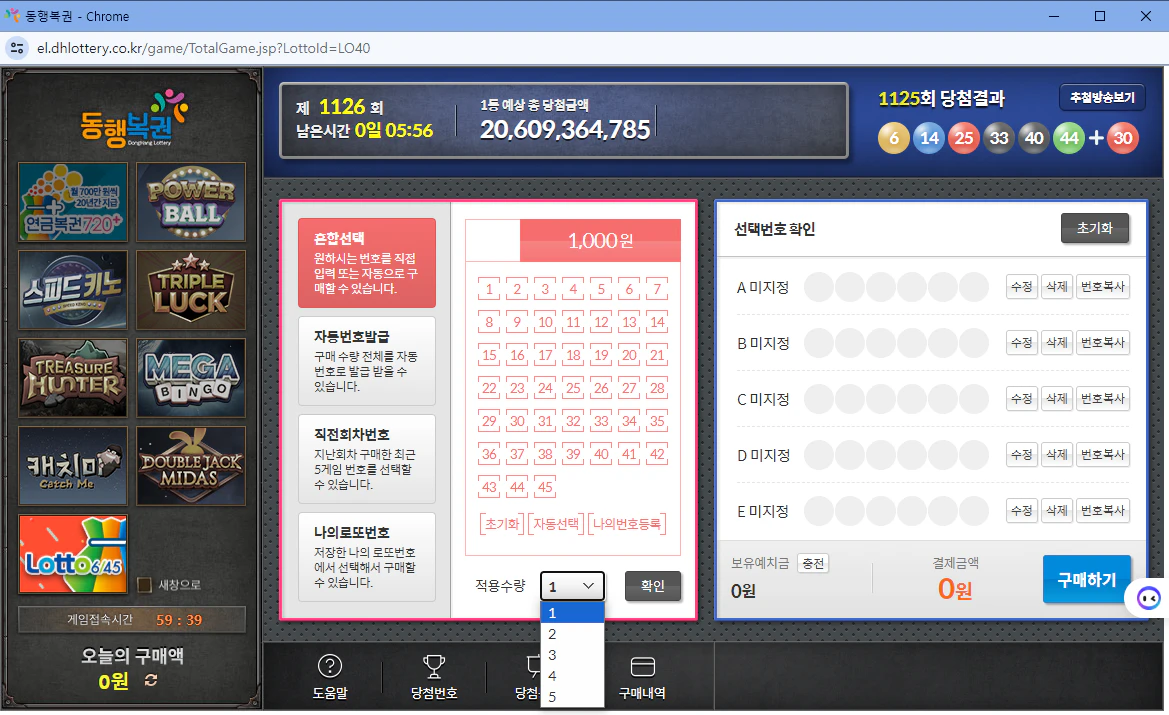 - 복권 구매 탭을 선택하고 로또를 선택합니다.