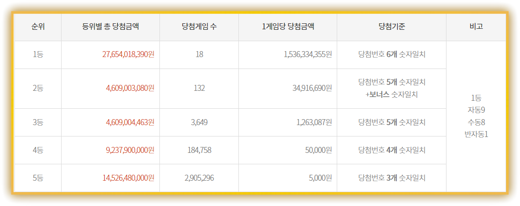 | 1등 | 18명 | 15억 3,633만 원 | 자동 9 / 수동 8 / 반자동 1 |