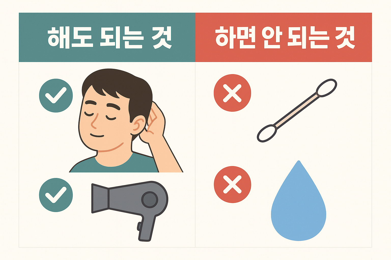 • 외이도 안 깊숙이 넣기: 귀지·물 더 밀림 → 마개 형성 → 먹먹함·염증