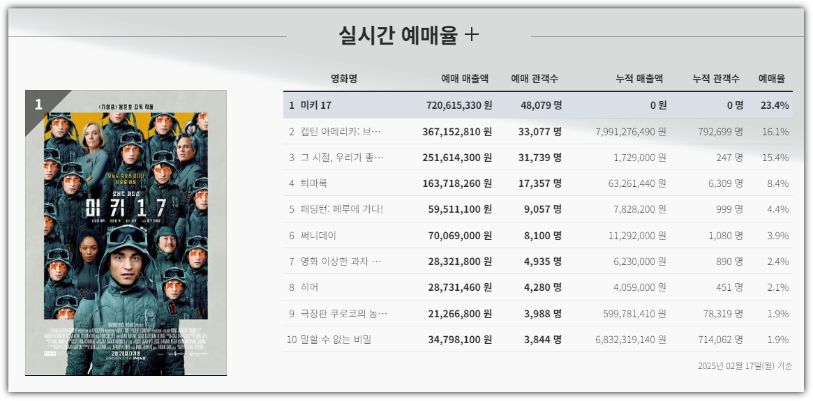 - 카카오페이 예매권 이벤트: 카카오페이에서 ‘미키 17’ 예매권을 추첨을 통해 70명에게 증정하는 이벤트 진행 중.
