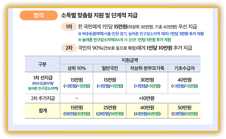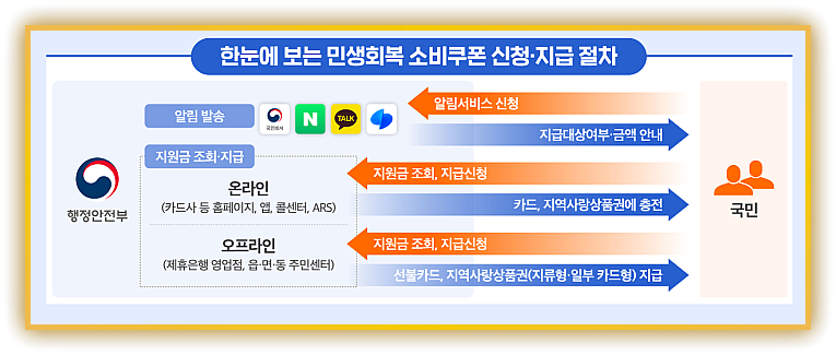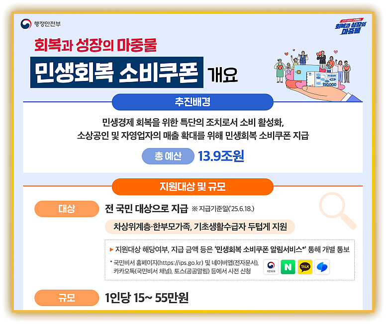 행정안전부는 2025년 7월 21일부터 모든 국민에게 ‘민생회복 소비쿠폰’을 지급한다. 지급 방식은 ▲신용·체크카드 충전 ▲지역사랑상품권(지류·모바일·카드형) ▲선불카드 세 가지 중 하나를 선택할 수 있다. 1차(7 월 21 일 ∼ 9 월 12 일)와 2차(9 월 22 일 ∼ 10 월 31 일)로 나뉘며, 사용 기한은 11월 30일까지다. 잔액은 기한이 지나면 소멸한다.