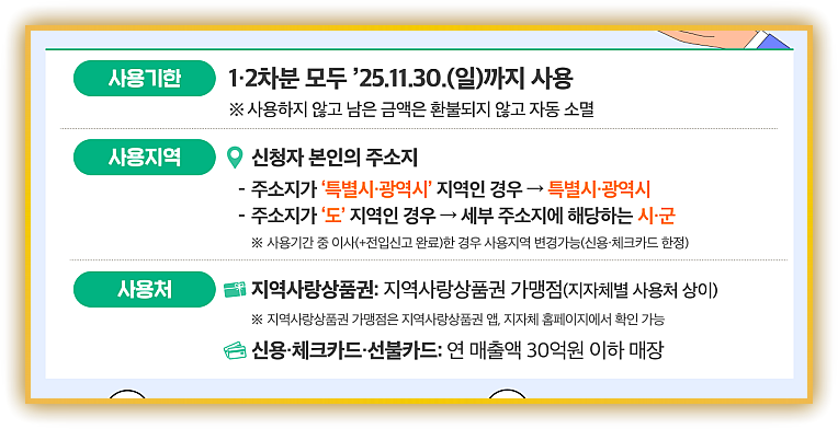 • 사용 불가: 대형마트·백화점, 면세점, 기업형 슈퍼마켓(SSM), 영화관 직영 매점, 스타벅스(직영), 골프·귀금속·유흥 향락업, 온라인 쇼핑몰 등.