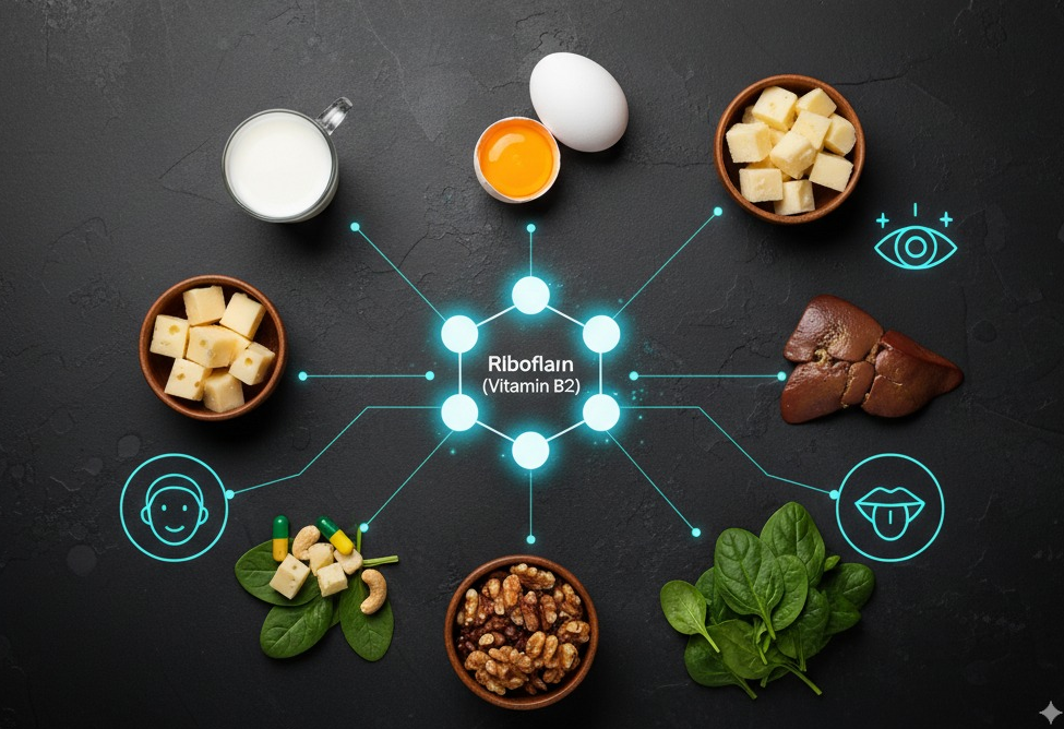 - 기능: 에너지 생산, 지방과 단백질 대사, 항산화 작용에 관여. 피부, 점막, 눈 건강 유지.