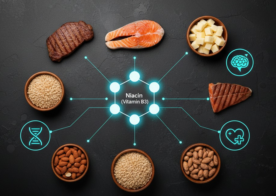 - 기능: 에너지 대사, DNA 복구, 피부 건강, 신경계 기능 지원.