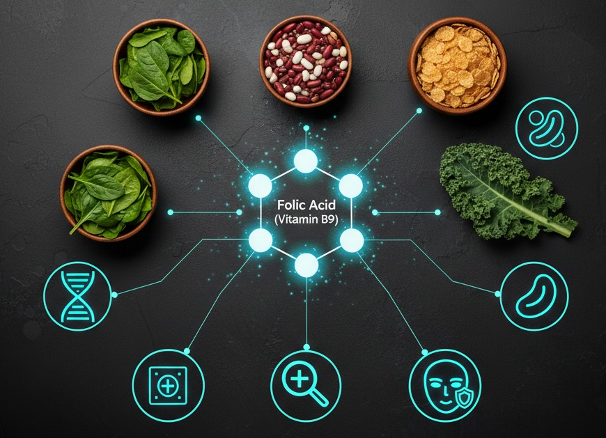 - 기능: DNA 합성, 세포 분열, 적혈구 형성. 특히 임신 중 태아의 신경관 발달에 중요.