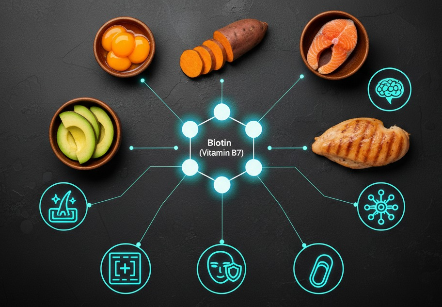 - 기능: 피부, 머리카락, 손톱 건강, 지방과 단백질 대사.