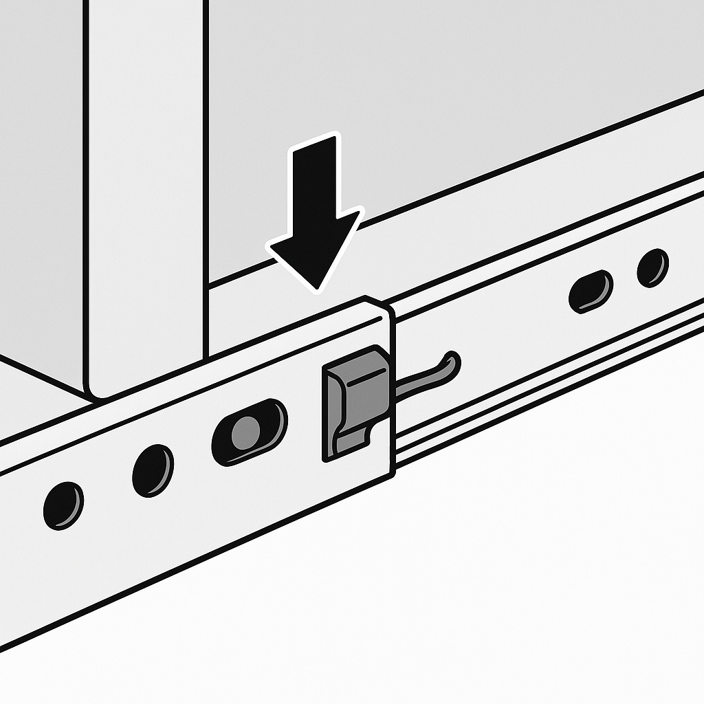 - 대부분의 서랍은 양쪽 레일 안쪽에 있는 레버(걸쇠)를 위나 아래로 누르면 분리가 가능합니다.