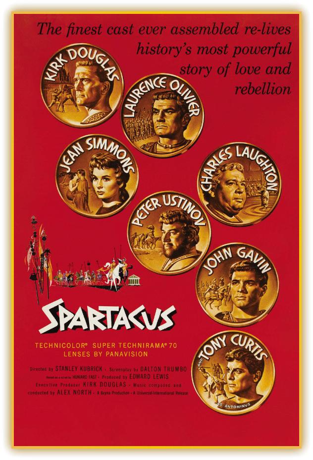 - 주연: 커크 더글라스 (스파르타쿠스 역), 로런스 올리비에, 진 시몬스, 찰스 로튼