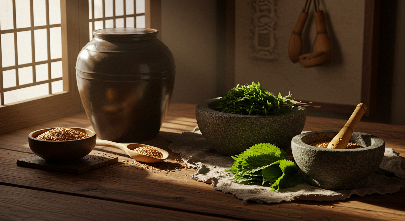 까치발 들어 참깨를 털어 모은 뒤 돌확에 한겨울 밤새 눌러서 짜낸 참기름은 조선 시대 부엌의 귀한 보물이었다. 향이 쉽게 날아가 냉장고도 없던 시절, 새해 첫 나물에 ‘갓 짜낸 기름 한 방울’을 넣는 것이 큰 행사였다. 들깨로 낸 들기름은 묵국과 수제비에 고소함을 더해 주는 풍미유로 사랑받았다. 이때까지만 해도 기름을 ‘사서’ 쓰는 개념은 희박했고, 가내 채유가 상식이었다.
