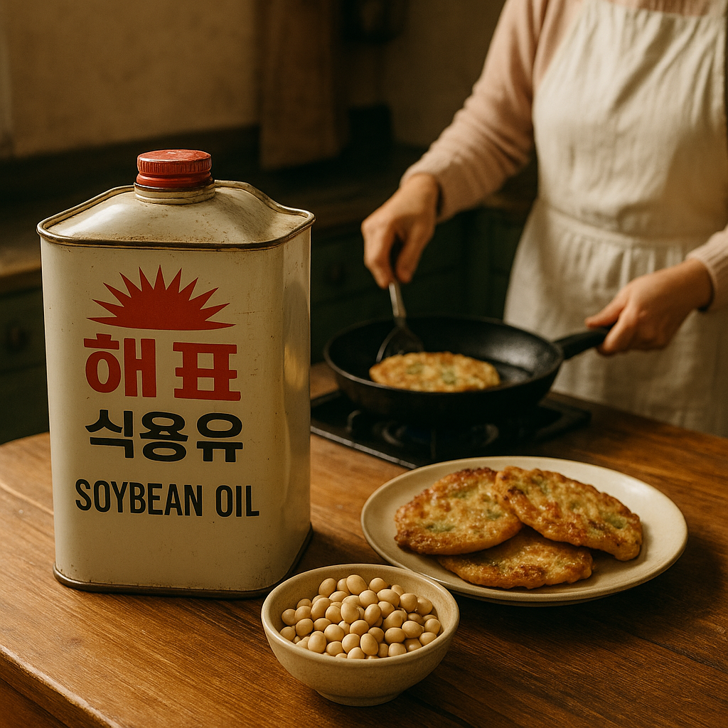 6·25 전쟁 직후 미국 농산물 원조(PL‑480)로 대량 유입된 탈지대두는 한국 식품 산업 지도를 바꿨다. 1971년 동방유량이 ‘해표 식용유’(정제 대두유)를 출시하며 ‘식용유’라는 단어가 콩기름과 동의어가 됐다. 집집마다 새하얀 주전자 모양 통을 비치하고, 전을 부치든 튀김을 하든 ‘식용유’라 불렀다.