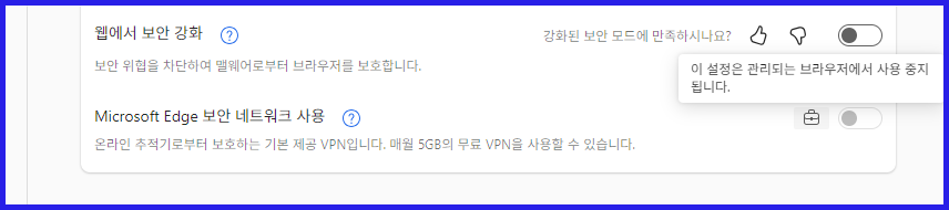 하단으로 스크롤하면 Microsoft Edge 보안 네트워크 사용 메뉴가 있습니다.