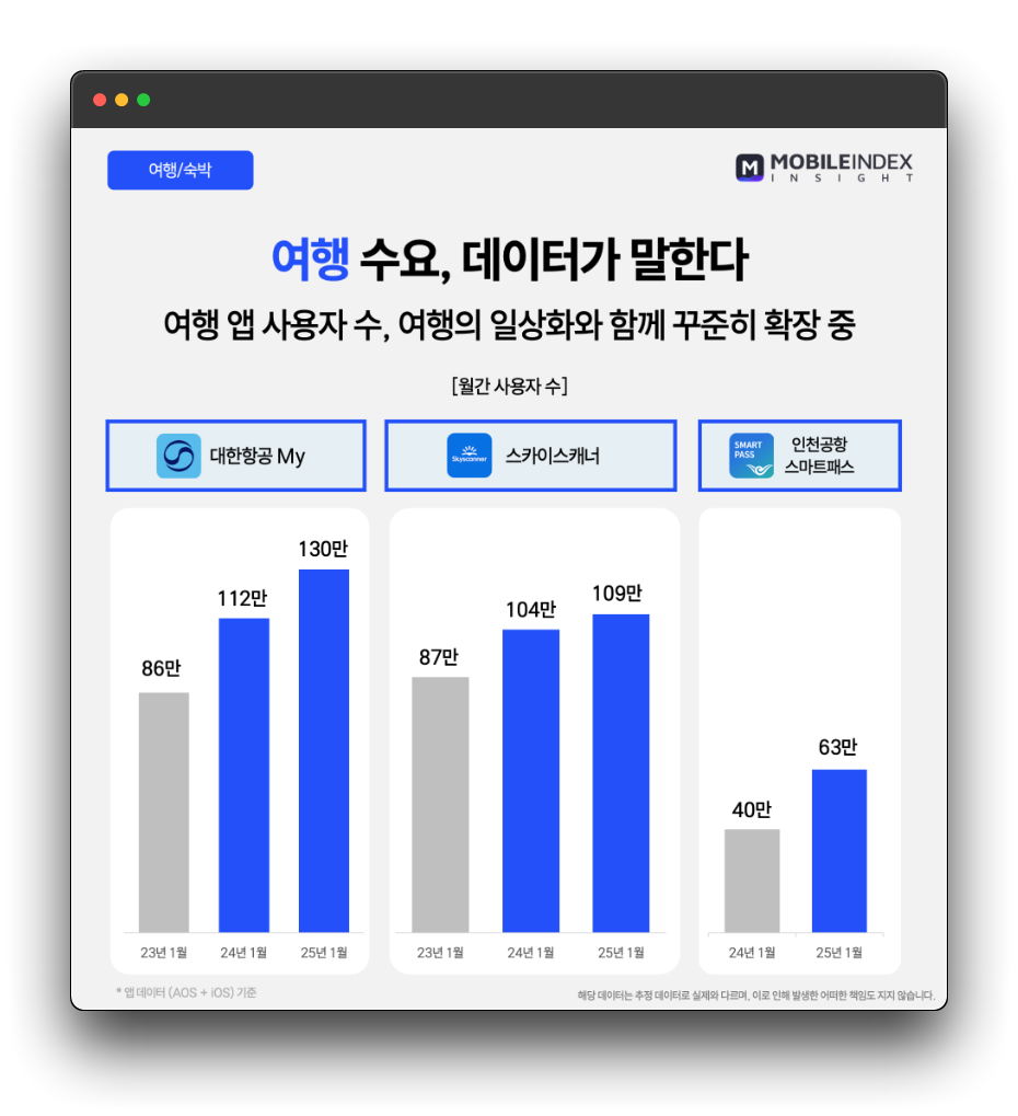 그 다음에는 "모바일 앱 활성 기기 수" 이미지를 배치해보자. 야놀자, 여기어때, 에어비앤비 같은 주요 여행 관련 앱들이 얼마나 많은 사람들의 일상 속에 자리잡았는지를 증명해주는 자료다. 3천9백만 대라는 숫자는 단순히 여행을 떠나는 사람뿐 아니라, 여행을 계획하거나 꿈꾸는 사람들이 얼마나 많아졌는지를 보여준다.