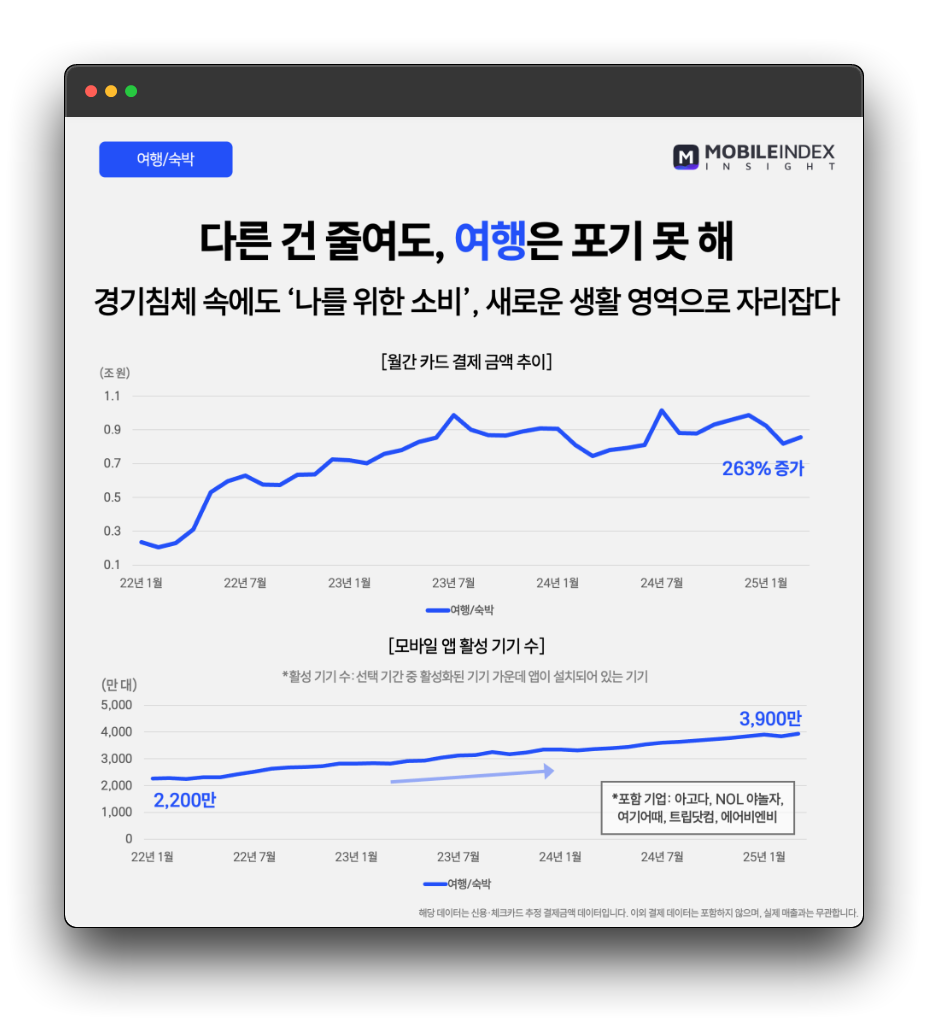 이 그래프는 경기침체 와중에도 여행 소비가 얼마나 꾸준히, 심지어는 폭발적으로 늘고 있는지를 직관적으로 보여준다. 특히 2022년 초에 비해 2025년에는 무려 263%나 증가했다는 점은 독자들에게 강한 인상을 줄 수 있다.