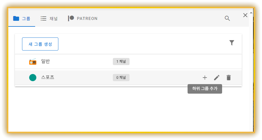 • 그룹 만들기 / 하위 그룹 만들기: 채널을 관심사별로 폴더처럼 분류(하위 그룹은 후원해야 가능)