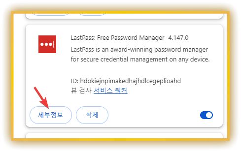 2단계: '세부정보' 찾기 시크릿 모드에서 사용하고 싶은 확장 프로그램 이름을 찾아서 하단의 '세부정보' 버튼을 클릭합니다. (예: 구글 번역 확장 프로그램의 '세부정보' 클릭)