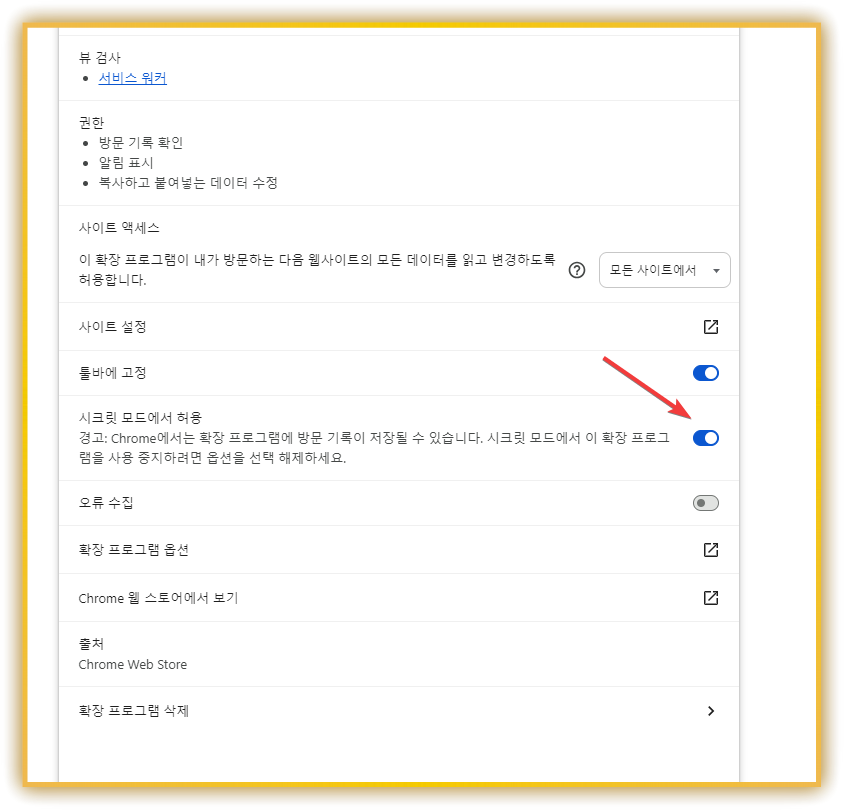 ⭐ 참고 팁: 시크릿 모드에서 확장 프로그램 사용을 허용하는 것은 해당 확장 프로그램을 신뢰한다는 의미입니다. 반드시 공식적이거나 신뢰할 수 있는 확장 프로그램에만 이 설정을 적용해 주세요.