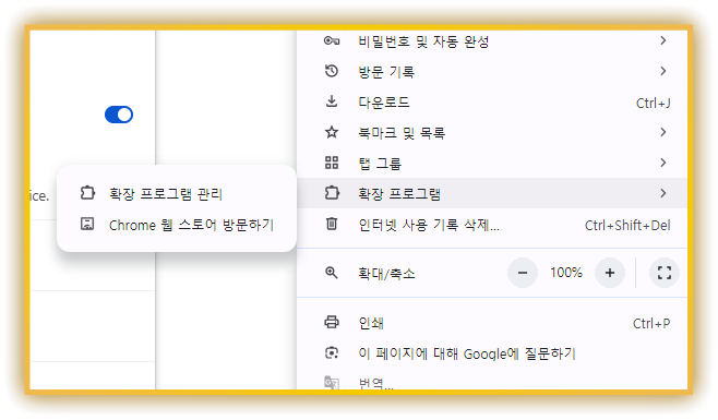 1단계: 관리 페이지 접속 크롬에서 확장 프로그램 목록을 엽니다. 주소창에 chrome://extensions를 입력하거나, 우측 상단 점 3개확장 프로그램확장 프로그램 관리 클릭