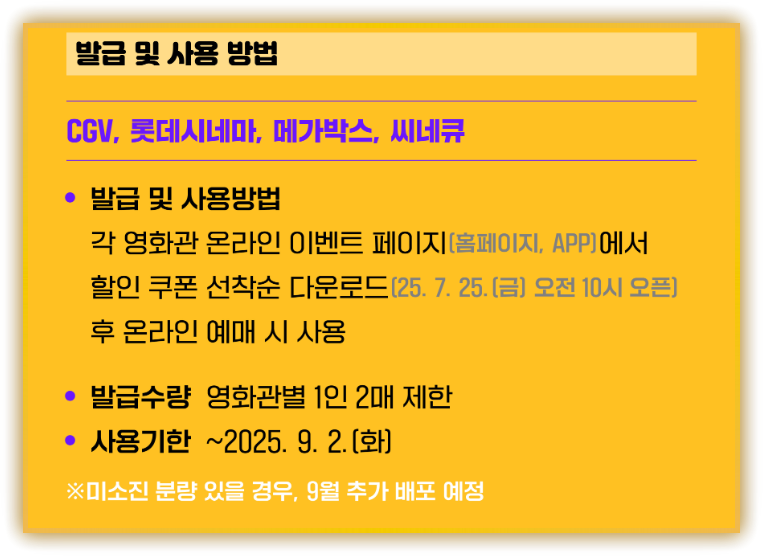 - 멀티플렉스 4사(CGV, 롯데시네마, 메가박스, 씨네큐): ~ 2025년 9월 2일(화)