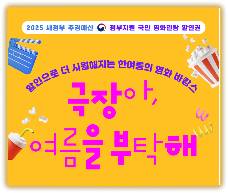 2025년 7월 25일 오전 10시부터 정부 지원으로 영화 관람료를 6천 원 할인받을 수 있는 '국민 영화 할인권'이 지급됩니다. 총 450만 장이 배포되며, 조기 소진될 수 있으므로 서둘러 다운로드하는 것이 좋습니다.