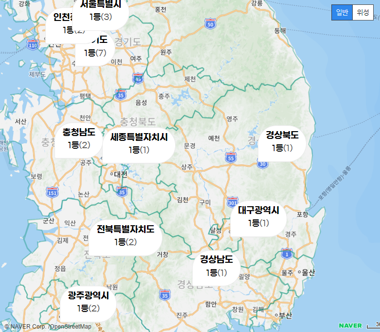 1등은 전국적으로 고르게 분산되었지만,