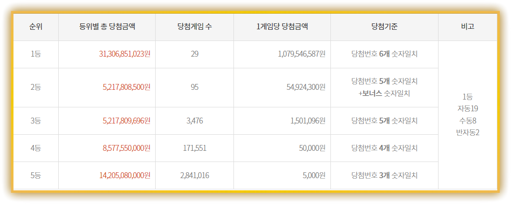 | 1등 | 29명 | 10억 7,954만 원 | 자동 19 / 수동 8 / 반자동 2 |
