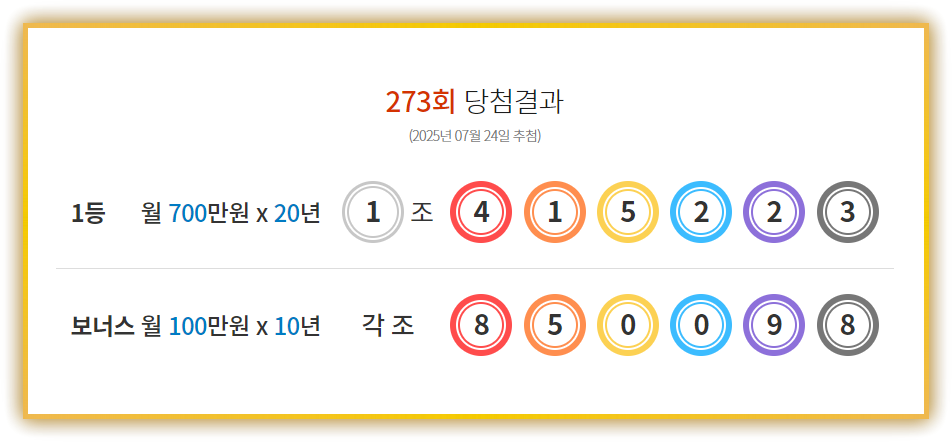 2025년 7월 24일 발표된 제273회 연금복권 720+ 당첨번호는 다음과 같습니다: