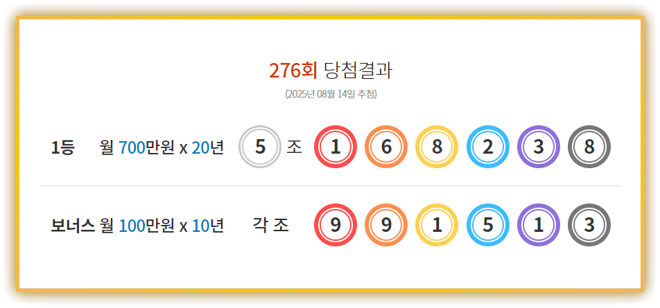 2025년 8월 14일 발표된 제276회 연금복권 720+ 당첨번호는 다음과 같습니다: