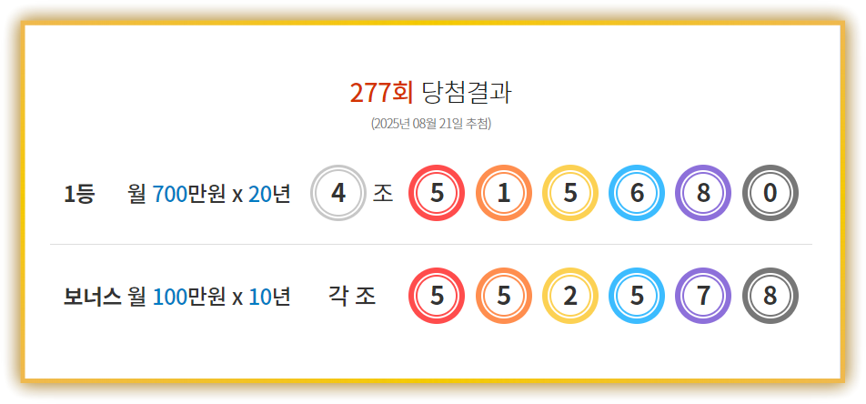 2025년 8월 21일 발표된 제277회 연금복권 720+ 당첨번호는 다음과 같습니다: