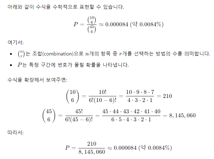 - 예를 들어, 모든 번호가 특정 구간(10개 숫자) 내에서 발생할 확률은 다음과 같이 계산됩니다: