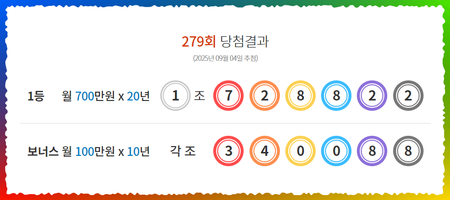 2025년 9월 4일 발표된 제279회 연금복권 720+ 당첨번호는 다음과 같습니다: