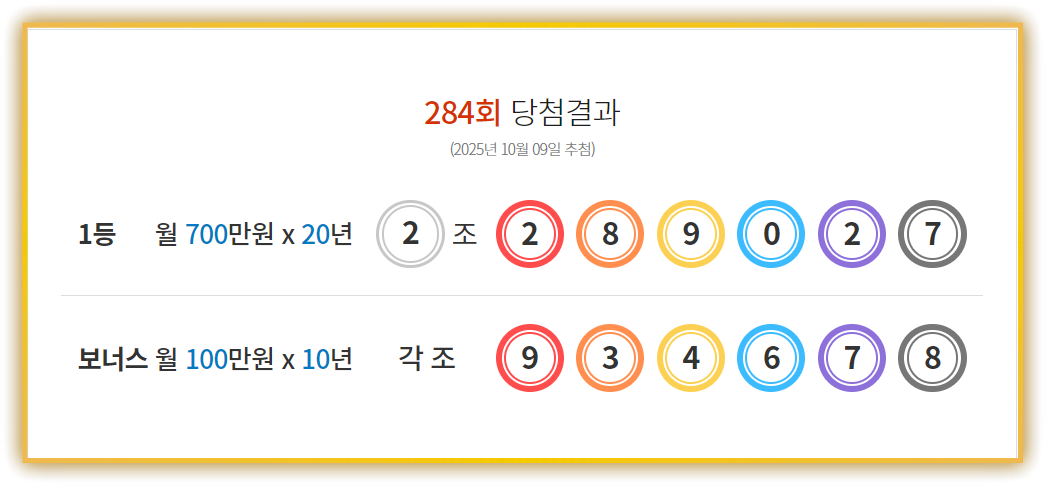 2025년 10월 9일 발표된 제284회 연금복권 720+ 결과입니다.