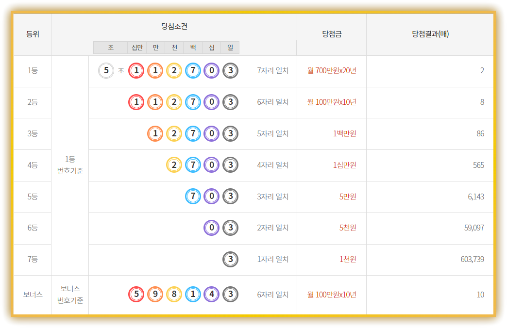 - 1등 2매 · 2등 8매 · 3등 86매 · 4등 565매 · 5등 6,143매 · 6등 59,097매 · 7등 603,739매 · 보너스 10건
