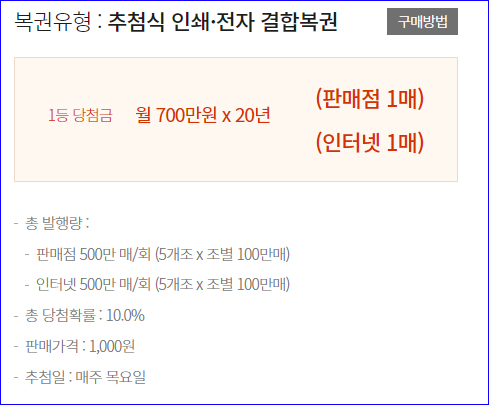 1등은 월 700만 원 × 20년, 보너스는 월 100만 원 × 10년 연금 방식.
