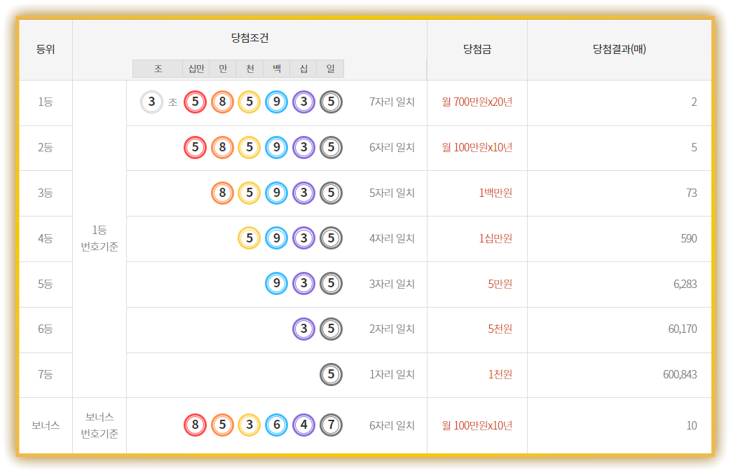 - 당첨 매수: 1등 2매 · 2등 5매 · 3등 73매 · 4등 590매 · 5등 6,283매 · 6등 60,170매 · 7등 600,843매 · 보너스 10건