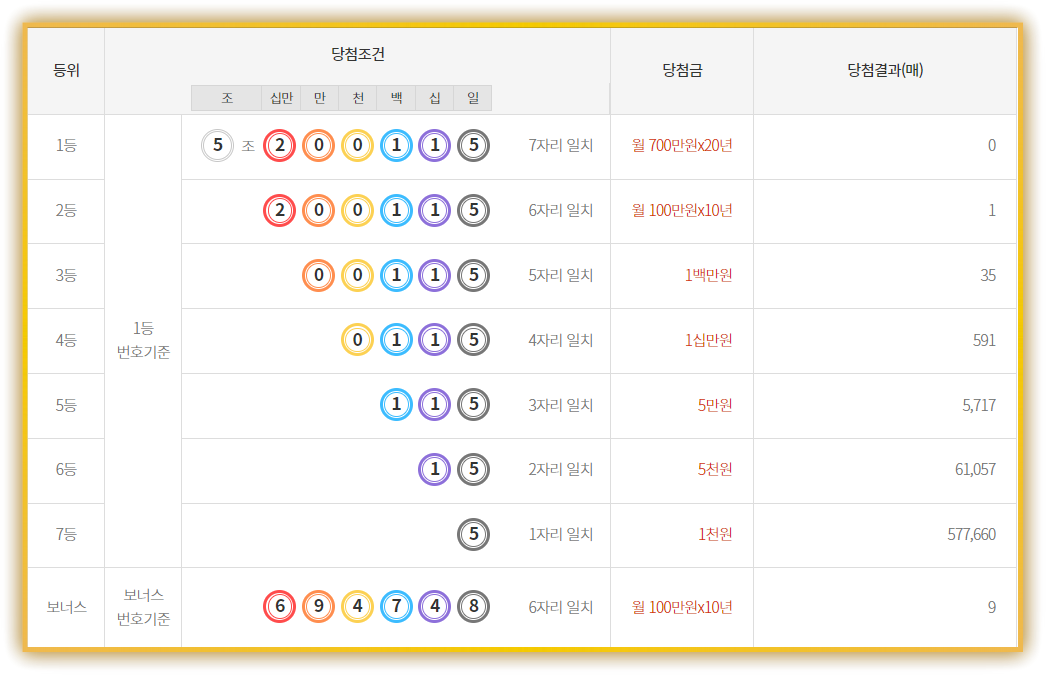 당첨 매수: 1등 0매 · 2등 1매 · 3등 35매 · 4등 591매 · 5등 5,717매 · 6등 61,057매 · 7등 577,660매 · 보너스 9건
