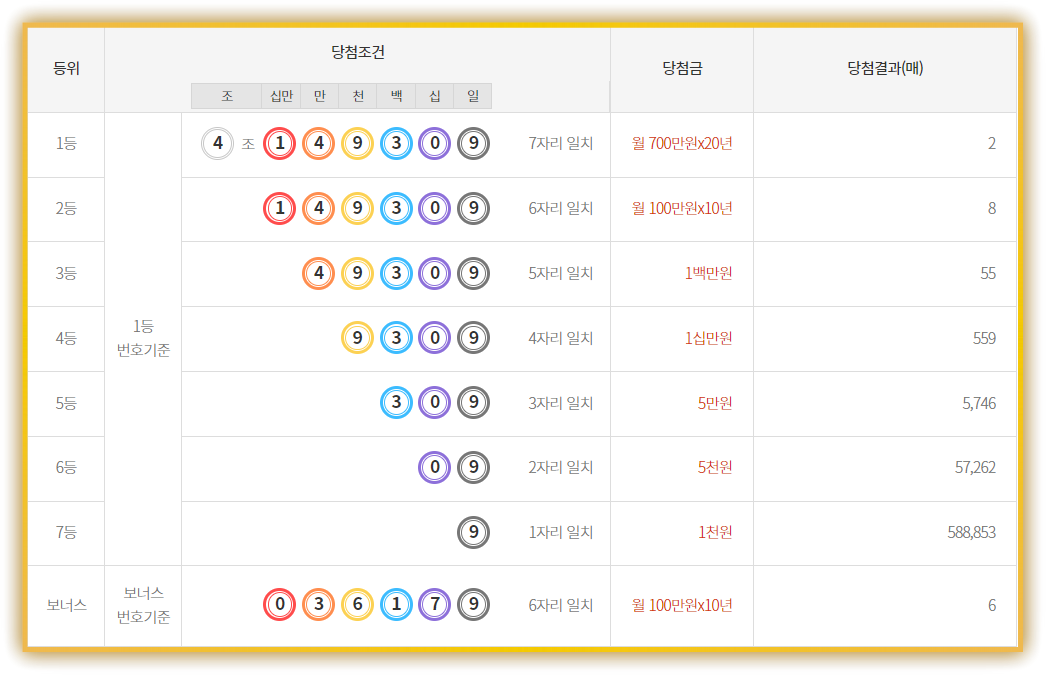 1등은 4조 149309, 보너스는 각 조 036179.