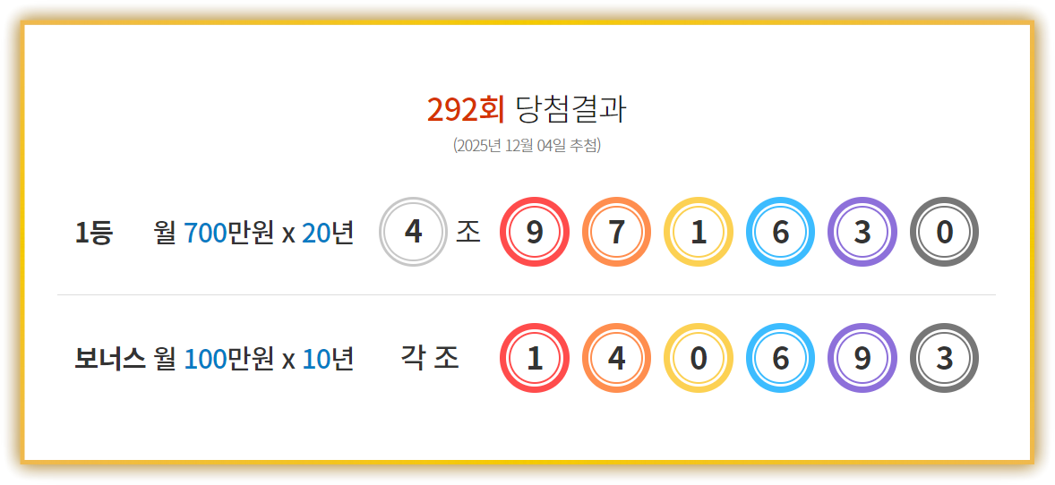 292회는 1등 4조 971630, 보너스 각 조 140693,충남 아산 드림통신의 1·2등 집중 배출,여주시 ‘금강양품’ 중심 보너스 분포가 특징이었습니다.