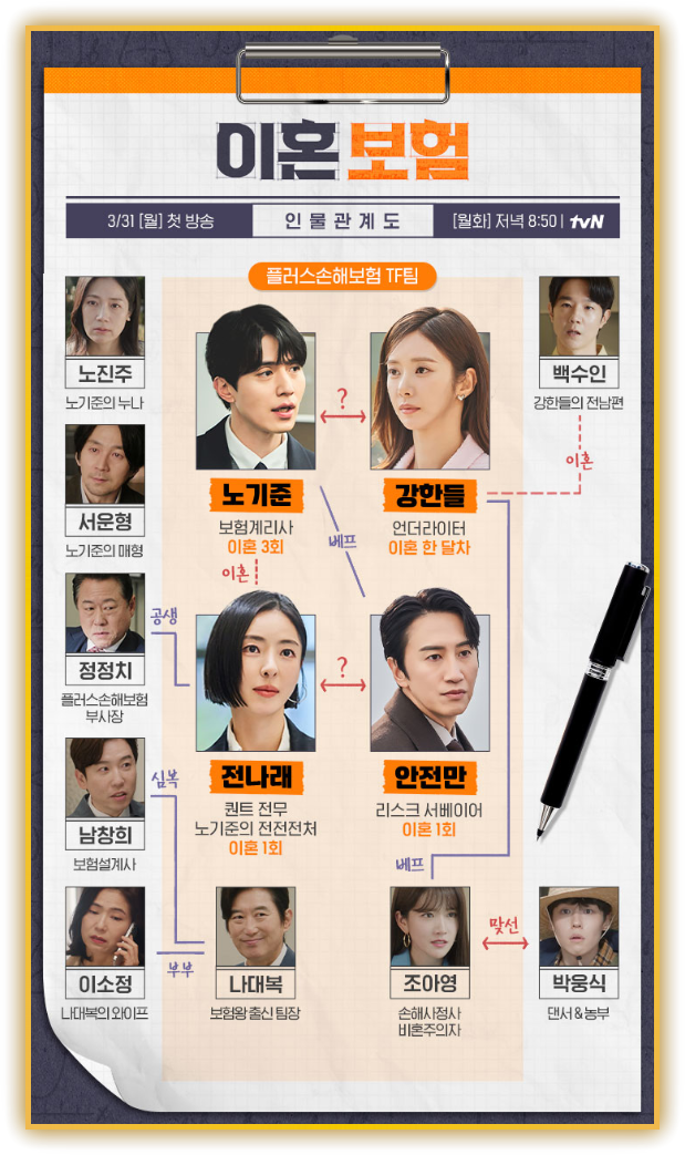 [3월 31일 첫방송] tvN 월화드라마 '이혼보험' – 이동욱·이주빈의 현실+로맨스 콜라보! 인물관계도 & 줄거리 정리